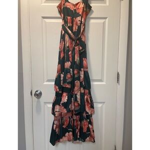 Color/pattern: dark green multicolor Approximately 56.5in from shoulder to hem Design details: satin design, adjustable shoulder straps, attached tie sash, tiered skirt, slit at hem Center back zipper with hook-and-eye closure Shell: 95% polyester, 5% spandex Lining: 100% polyester
