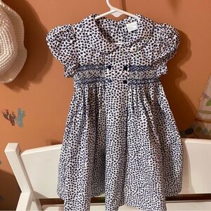 Blue flowered Edgehill Dress. Cutest little 4 buttons on the front with Smocking. Round little collar and puff sleeves. Sz 24 mo. See the pic for how cute this is on. Cotton and Polyester.