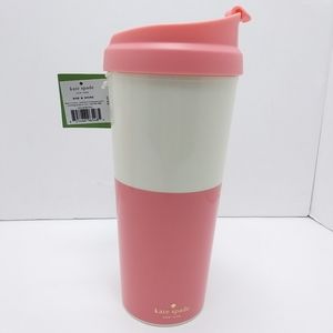 NWT Kate Spade 16 oz thermal mug 8" tall, 3" diam opening. Perfect pink & off-white smooth glossy plastic, Message in bold black letters. Flip top sip. Makes a great gift or gift card holder! Everyday wonderful Kate Spade!