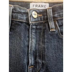 This Frame denim skirt is a size 24 and is a dark blue color. It is a high-waisted skirt with a raw hem and a frayed hem. The skirt is in excellent condition.