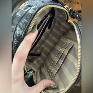 Brahmin quality round crossbody bag, black with pink flowers, olive leaves. One outside pocket 3 credit card pockets and a zipper pocket and a key holder inside. Two the beige stripe lining. Adjustable removable strap and a small hand strap. Double zip across top. Dust bag and cards included. Very good barely used condition.