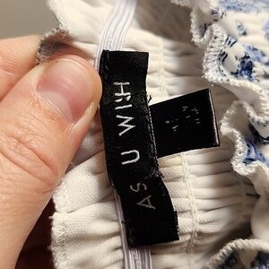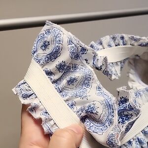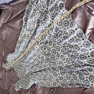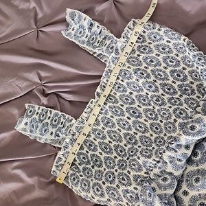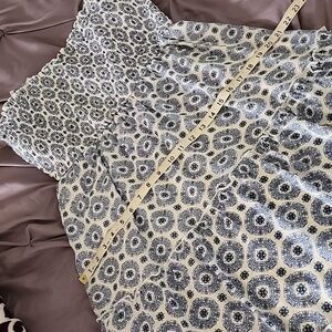 Cute, gently worn, midi, square neck, boho style dress. The top portion is ribbed with stretchy straps, and the bottom is a little flowy with some ruffling. It has a lining attached underneath the dress as shown in photos. The dress is white with multiple blue circular and other patterns throughout. The size is Xlarge, and there are measurements in the photos as well. Has stretch to it. GUC! No flaws noticed. Comes from a smoke-free home. Please ask any questions before buying. Make an offer or bundle more than 1 of your likes from my closet for a discounted price! π