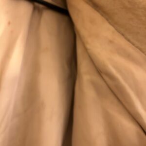 NO NAME Luxurious and stylish, this beige fur coat offers warmth and elegance. Perfect for any occasion, it adds a touch of sophistication to your wardrobe. There are some stains on the inside. Selling as is. There is no size, but it fits like M/L. The sleeves are above the wrists. Angie is stitched on the inside