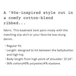 This Madewell tank top is a stylish piece for women in size XXS. The sleeveless top has a boat neck and a cropped length, perfect for a casual or workwear look. Made from a blend of polyester and cotton in a white ribbed jersey fabric, this top features a solid pattern with a stretchy fit. It is machine washable and suitable for travel, offering a bohemian, classic, or 90s-inspired style.