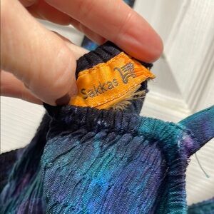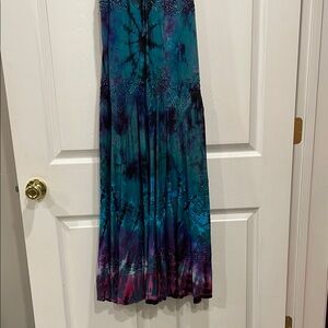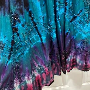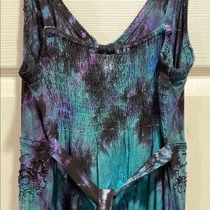 Vibrant tie-dye dress with spaghetti straps. Features intricate detailing on the bodice. Perfect for casual outings.