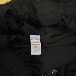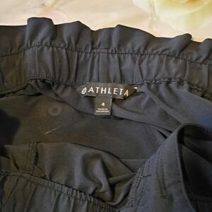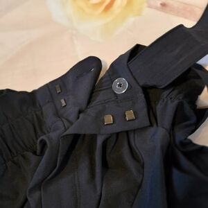 Color: black with a paper bag style waist, with a belt. they also have a slide hook style clasp in the front as well. super cute shorts in excellent condition. light weight, good for hiking & summer outdoor activities.
