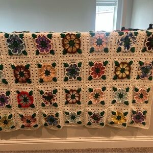 Beautiful crochet blanket with colorful granny squares. Appliqué "3D" style flower design. Intricate design with a variety of colors. Perfect for adding a cozy touch to any room.