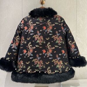 *SOLD* Vintage Oriental Satin Jacquard Cape Jacket w/ Pearl Beaded Faux Fur Trim