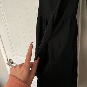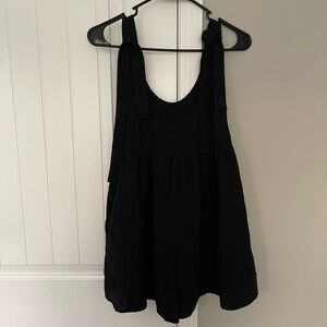 Black Romper with ties on the sleeves. Super cute with a tee or turtleneck underneath! has pockets