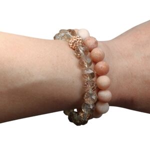 New without tags/box Betsy Pittard Designs 2 Piece Beaded Stretch Bracelet Set, super cute! One bracelet has clear-ish crystal looking beads and a single round pink bead covered in crystals. The other bracelet has round matte finish beads that are varying colors of pink and white in a marbled type pattern. Wear together, separately, or mix and match with other bracelets!