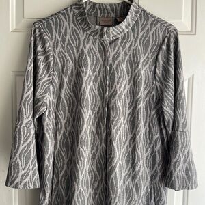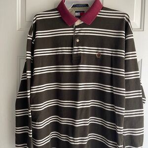 Very soft fleece sweatshirts with blue and white striped buttoned plackets and curved hemlines
