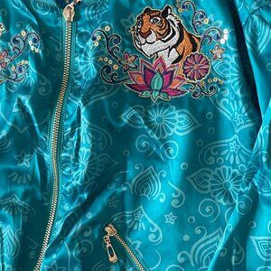NEW WITH TAGS! Kids Size 13, BEAUTIFUL and gently used, Disney Rajah, from Aladdin, “Jasmine” Bomber Jacket, with dolman sleeves, embroidered appliqués on both shoulders, and featuring Rajah, Jasmine's tiger, with flowers, and sequin detailing. Has gold colored zipper accents, and ull front gold colored zip. The beautiful Interior design features Jasmine screen art in the satin feel lining. Characters are from the movie ALADDIN. No longer selling at Disney Store.