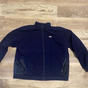 This lightweight jacket features a solid navy blue color and a full-length zipper for easy wear. It has a stand-up collar and long sleeves, providing a comfortable fit for casual outings.