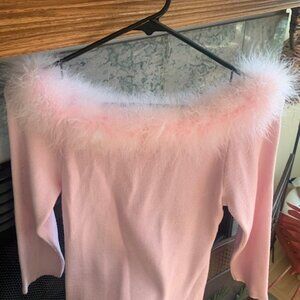 Cute, soft, and PINK, with faux fur pink collar, no stains or tears, 3/4 sleeves,