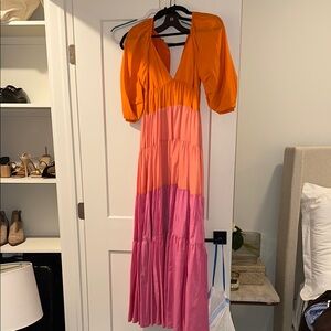 This STAUD dress features a vibrant yellow and light lime green striped pattern that creates a cheerful summer look. It has thin adjustable white straps and is designed to be form-fitting and knee-length, made from lightweight and stretchy fabric for comfort.