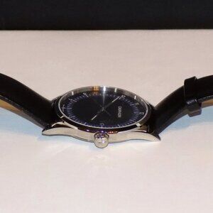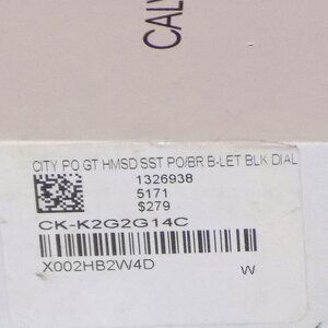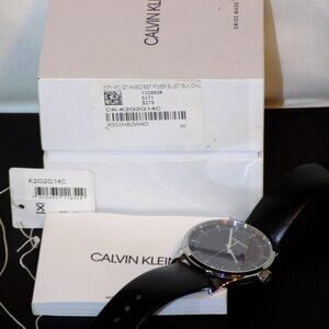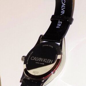 Watch comes with instruction manual, tag & original case with display pillow. I installed a new battery & watch is running properly. Inside watch under caseback reads, "Swiss V8" and "3 jewels". 43mm case, 7.5mm thick, 20mm black leather band. Sapphire crystal, all stainless steel, water resistant 3bar. "Calvin Klein" stamped inside black watch band. The mirror finish caseback has some light scratches but they don't show up in photos. The white case has some dark marks/scuffs on the lid - see pics. $279 price on case sticker.