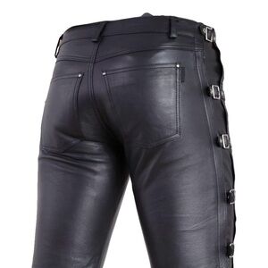 Stylish black leather pants with buckle details. Perfect for a bold look. Pair with boots for an edgy style.