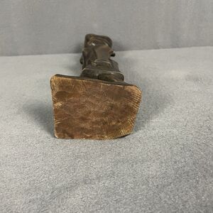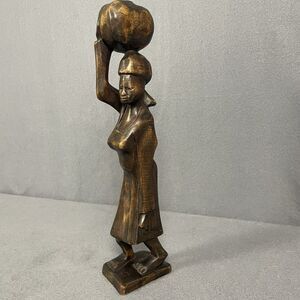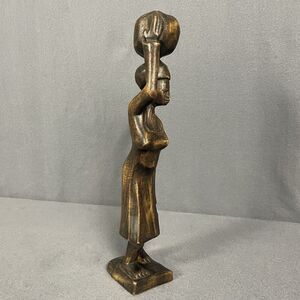This vintage African hand-carved wood folk art tribal statue depicts a woman carrying water, showcasing intricate craftsmanship and cultural significance. The piece is handmade and reflects traditional African artistry, likely originating from an African culture. The provenance of the statue's ownership history is not available, adding to its mysterious and unique appeal as a collectible item from the 1900s.