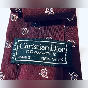 Vintage Christian Dior burgundy paisley print tie featuring high quality Italian silk, minimalist classic elegance, perfect for business or office wear or social gatherings. Measures approximately 3” wide. In excellent preowned condition.
