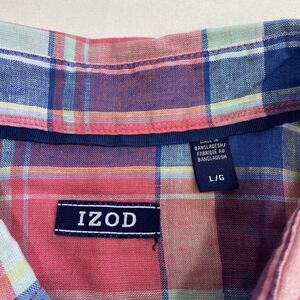 Izod Madras Linen Blend Shirt Mens Large Pink & Blue Plaid SS Lightweight Preppy