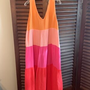Crinkled gauzy cotton in gorgeous bright colors, perfect for vacation and summer time. V neck in front and back. Forgiving but no stretch. Bottom of armhole to bottom of dress is 41 inches.
