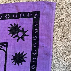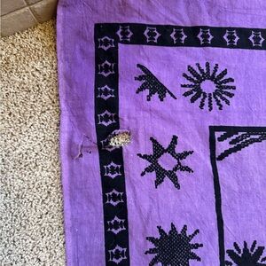 Awesome large purple tapestry. Measures 93” x 84” which is about 7’ x 7.5’. Vibrant yellow sun in middle surrounded with moons, stars and comets. Same pattern on both sides. Could be used as a bed cover, wall art and more.