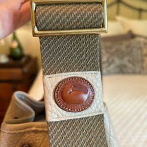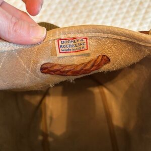 Hard to find bag in a color that will go with almost everything!!!! It features solid brass hardware, a slide adjuster on strap that allows for more strap length options, woven cotton twill strap with the duckie emblem sewn on, unlined, raw suede interior with the D&B tag intact as well as a GORGEOUS braided leather drawstring with tassels!