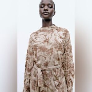 Zara Printed Jacquard Tie Waist Crinkle Wrinkle Effect long sleeve Midi Dress