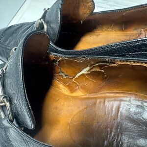 These Gucci loafers feature a sophisticated black leather construction with a textured finish, adding a unique touch to their elegant design. The slip-on style is complemented by a decorative silver-colored metal bar across the vamp, enhancing their refined appearance.