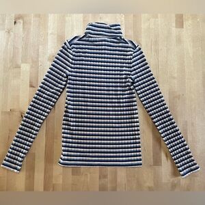 Grab this classic striped, soft ribbed turtleneck from Madewell while you can! I see you meeting the love of your life in a bookshop in this top. This is machine washable so you don’t need to be late for the metro and your hands can stay soft and smooth as you skip the hand washing. I’ve seen this coloring listed as Dark Mediterranean Windmill Stripe online, so enjoy that. This is made of 61% Polyester, 33% Viscose, 6% elastase. Material details and measurements listed in the pics. Academia, nerdy, soft, layering, striped, career, office, work, professional, career wear, job interview, casual, mature, stretchy, stretch, slim fit, soft, cozy, thin, comfortable, ribbed, comfy, knit, classic, simple, effortless, modest, academic, school, scholar, college, collegiate, girl next door, GND, relaxed, versatile, literary, textured, intellectual, practical, striped knit top. A10.
