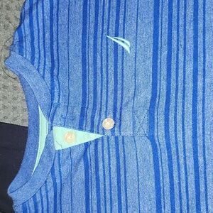Stylish blue striped Henley shirt by Nautica. Features a small logo on the chest. Comfortable and casual.