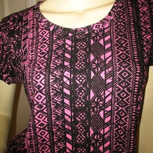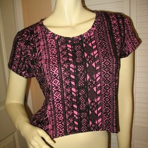 Y2K new womens cropped/semi-crop top tee shirt with short cap sleeve in multicolor pink and black Aztec print (tribal pattern). Asymmetrical hem design (high-and-low/hi-lo). NEW condition. Material is UNKNOWN, missing tag. Womens tops great as casual wear, summer tops, sun/beach wear, etc. Hurry! We only have ONE PIECE of this item!