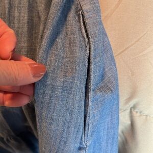 This dress is new without tags, it is lightweight 100% cotton, and has two side pockets. Length is approximately 47 inches long. Buttons are real, and there is an extra one attached to the tag on the inside. Color is the lighter denim shown in pictures 3 and 4. Got on sale with coupon for $30.