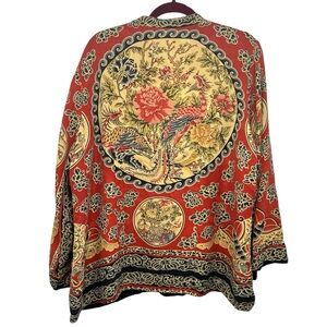 Elegant red jacket with intricate Asian-inspired patterns. Features floral and dragon print.