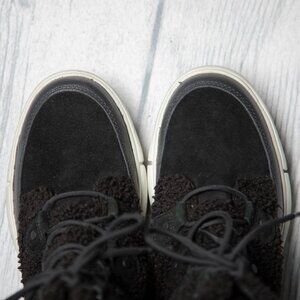 UPPER: Available in faux shearling with waterproof suede. Microfleece lining. Laces and faux shearling are not waterproof.