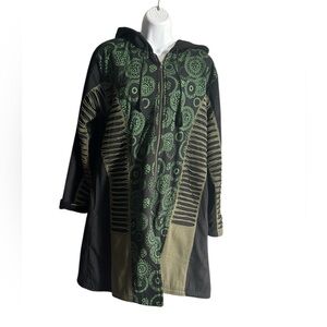 New with the tags. Hooded jacket with ties for the hood. Zips up the front. It has nice deep pockets pockets. 100% cotton and made in India. It’s very warm. Great jacket for Fall and Winter. Pit to pit is 22 1/2 or 45 inches around. Waist is 21 inches or 42 inches around. The hips are 25 inches or 50 inches around. The length is 36 inches. The liner inside is black. It’s a very warm fleece.