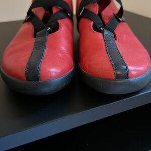 Excellent used condition Arche ballerina criss cross flats size 8 The most comfortable shoe you will ever wear Chic leather shoes with a unique design. Features bold red and black colors. Perfect for a standout look.