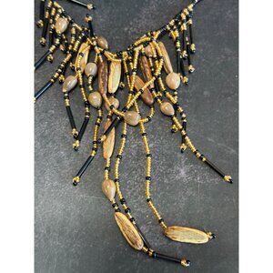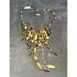 Artisan Amber Black Quartz & Nut Beaded Fringe Choker Necklace 14"