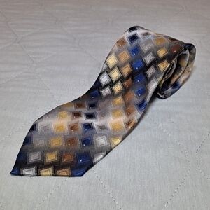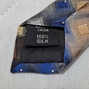 Stylish tie with a geometric pattern. Features shades of blue, gold, and brown. Perfect for formal occasions. Brand is Van Heusen. The material is 💯 silk. Multi-colored, blue, gold, brown, and silver. The pattern is geometric. The length is 59 inches, and the width is 3.5 inches. See photos for all measurements. Excellent factory perfect condition with no defects. I have a huge selection of silk designer neckties. Please consider making a bundle of two or more items from my closet for a nice discount and to save money on shipping costs too.