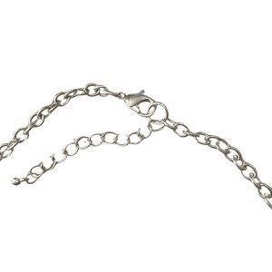 Silver chain measures 21” long w up to 2” extender. Necklace contains 9 teal “stones.” Rarely worn. No signs of tarnish or fading.