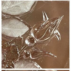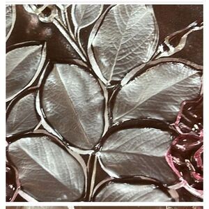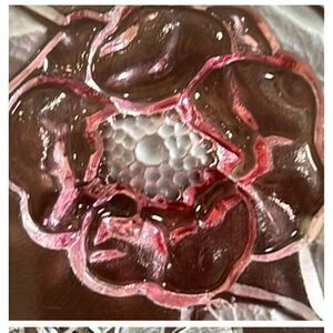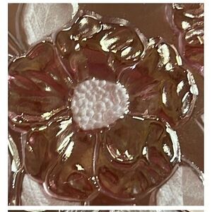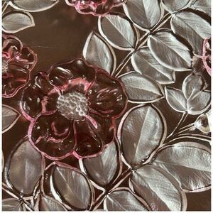 This elegant glass cake stand features a beautiful raised floral pattern in shades of pink and red.