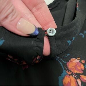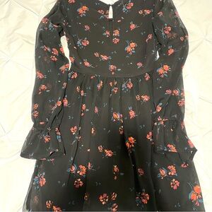 Hollister black floral print dress. This has a sheer overlay over the body of the dress, and sheer flutter sleeves with an elastic cuff at the wrist. Size XS. Back button closure. Worn twice by my daughter for cheer banquets.