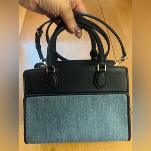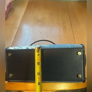 Beautiful blue vinyl with denim and embroidered panels. Front and one inner pocket - handles and shoulder strap. Used only twice - just too small for me. Dimensions in photos. No dust bag. Lives in a smoke-free home.