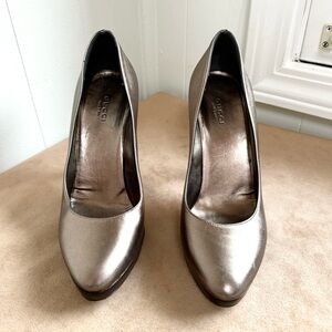 Platform pump shoes in Sasso / Stone, which is a Metallic Taupe color, with contrast brown platform. Beautiful heel design. Nappa Silk leather. Platform measures 0.5”. Heel height of 4.5”.