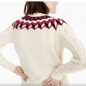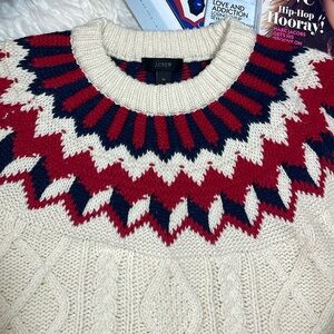 J.CREW Chunky Cable Knit Fair Isle Pullover Sweater. Ivory, Red, Navy Blue.