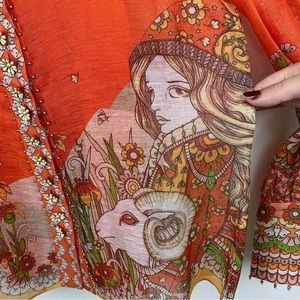 The Kaleidoscope Zodiac Body Shirt in Aries Zodiac Print from the Zimmermann Fall 2022 Collection, Stargazer. A silk linen organza blouse featuring tulle inserted at the sleeve head, flower detail functional buttons and a beaded trim. - Silk linen organza blouse