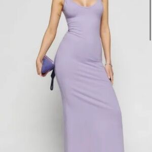 Look cute, be comfortable. Shop the Tyra Dress from Reformation, a sleeveless maxi dress with a scooped front and back neckline. In color lilac. Never worn, so this is new without tags.