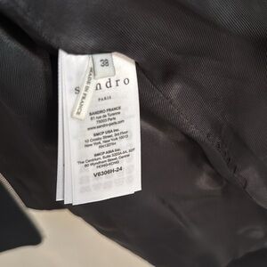 This Sandro blazer features a sophisticated black and white color scheme with a textured pattern. The cropped design and round neckline add a modern touch, while the solid black trim enhances its elegant appearance. Like new excellent size 38. With small secret front pockets
