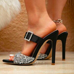 Size 6 Glamorous Rhinestone Buckle Stiletto Mules – Step Into Sophistication