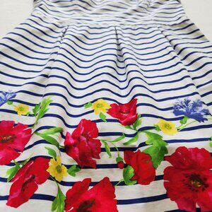 Fun and playful Chaps Ralph Lauren dress that combines classic stripes with a vibrant floral pattern. Crisp cotton fabric with a fit and flare shape, knee length. Size 12.